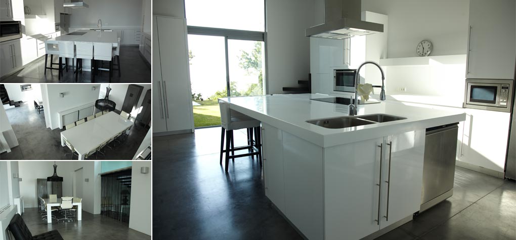 Spacious lounge with double height ceilings has as a compliment massive contemporary fire place; open dining area leads to the kitchen.