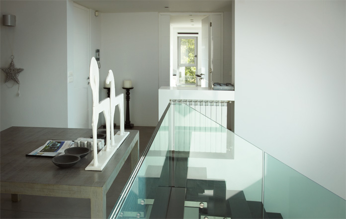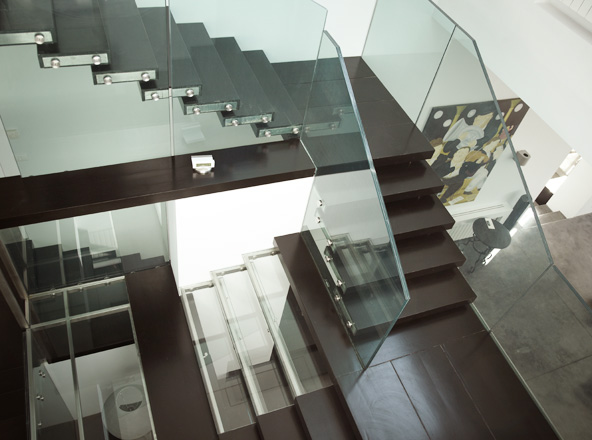 Modern stylish staircase runs through the all levels of the house with one piece of glass for structural support and treads made